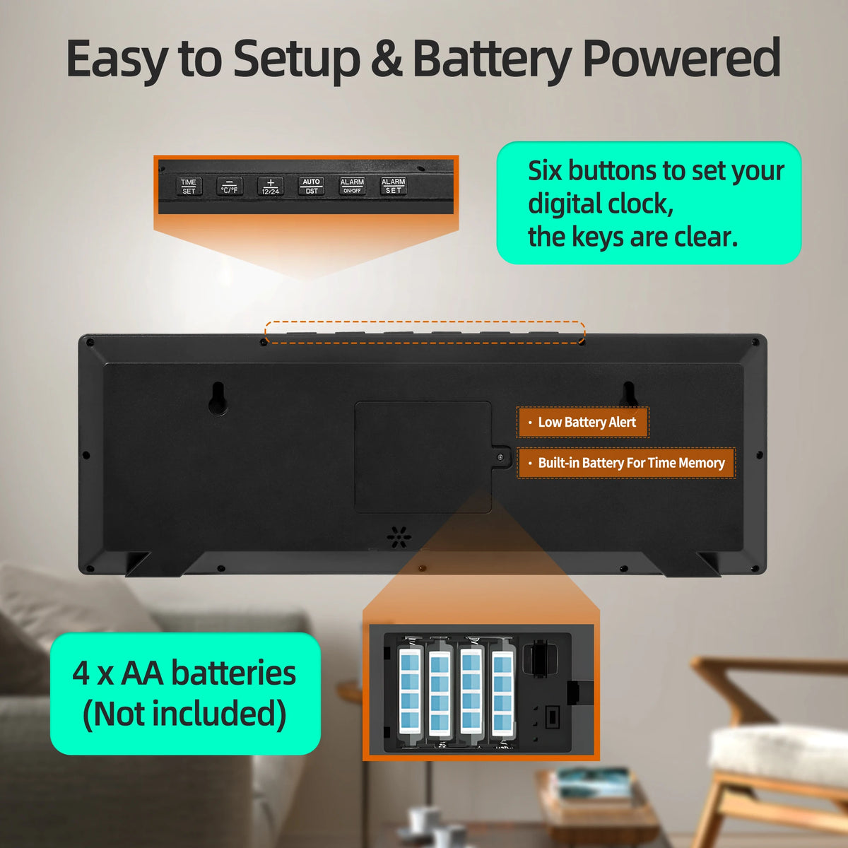 【BATTEY OPERATED】This clock is supported by 4xAA battery (not included).Normally, the clock can last 6-10 months with 4 brand new batteries. It will be shorter if you use alarm function. When the battery level falls below 5%, a low battery icon will come out and keep blinking to remind you to change battery.