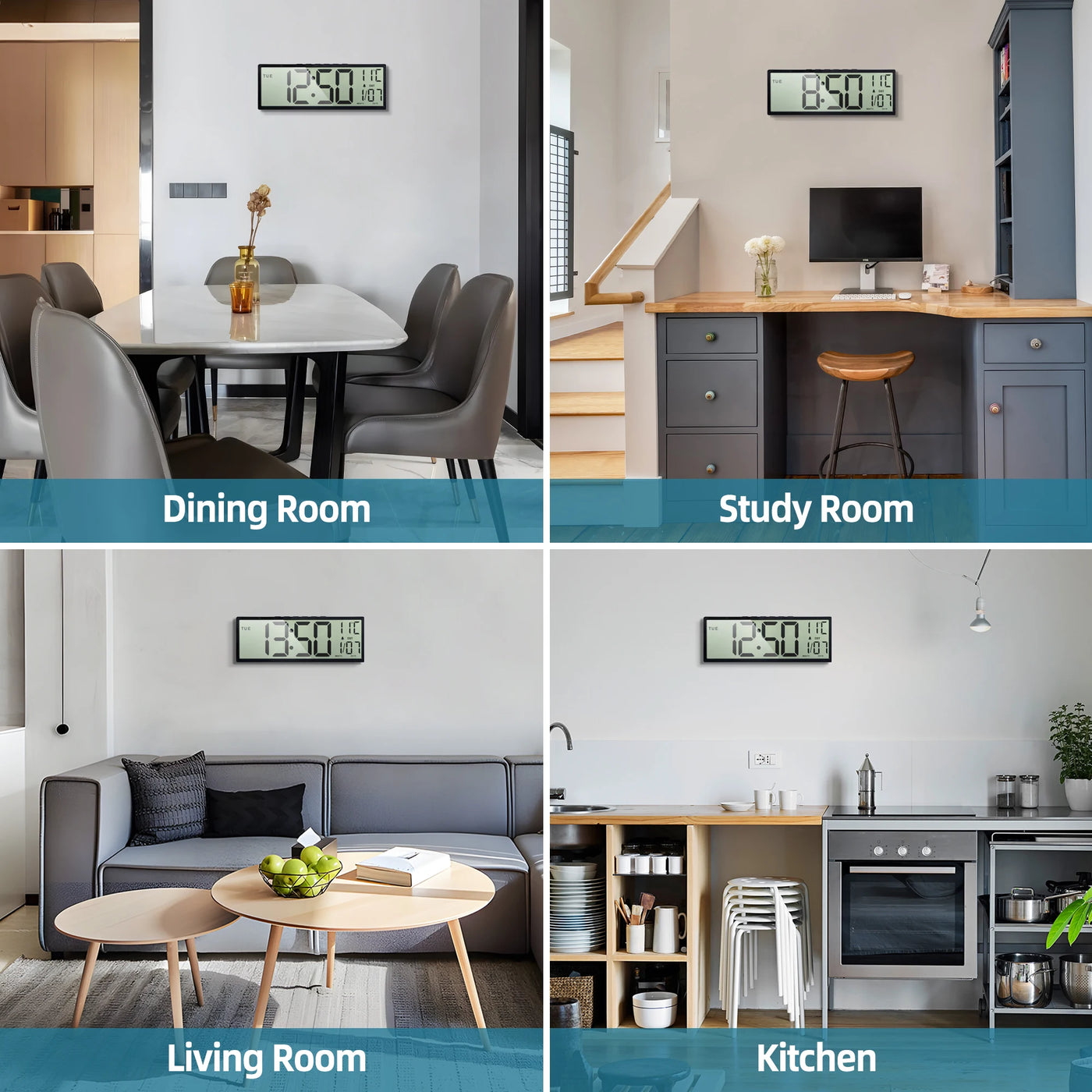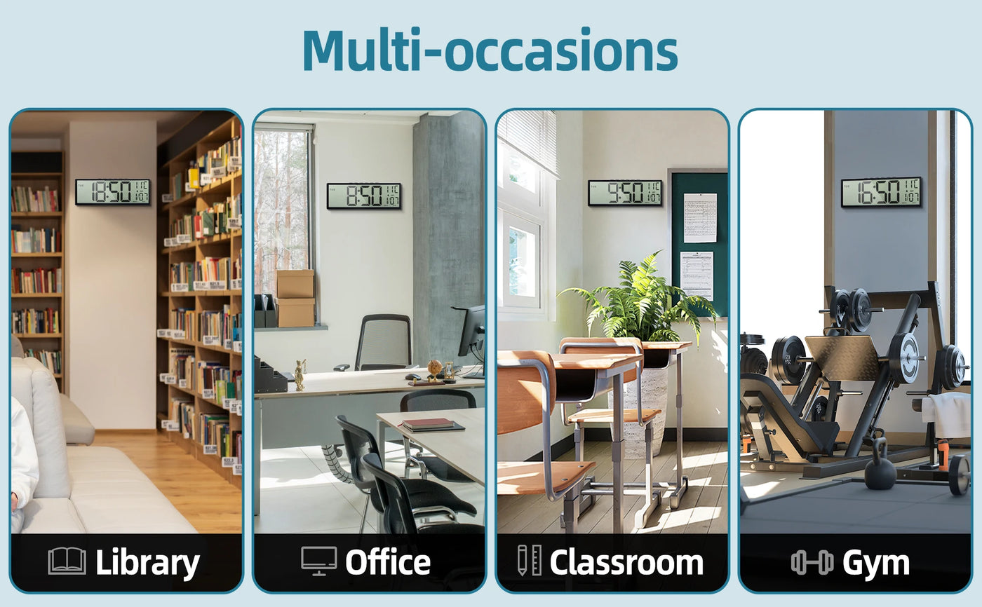 【EASY TO READ WITH BIG NUMBERS】Our digital wall clock has a 9.8x4.3 inch high-definition LCD screen and the time display is 6.7x4.3 inch. It helps you see clearly in a distance. You can also read the indoor temperature and date for full information.