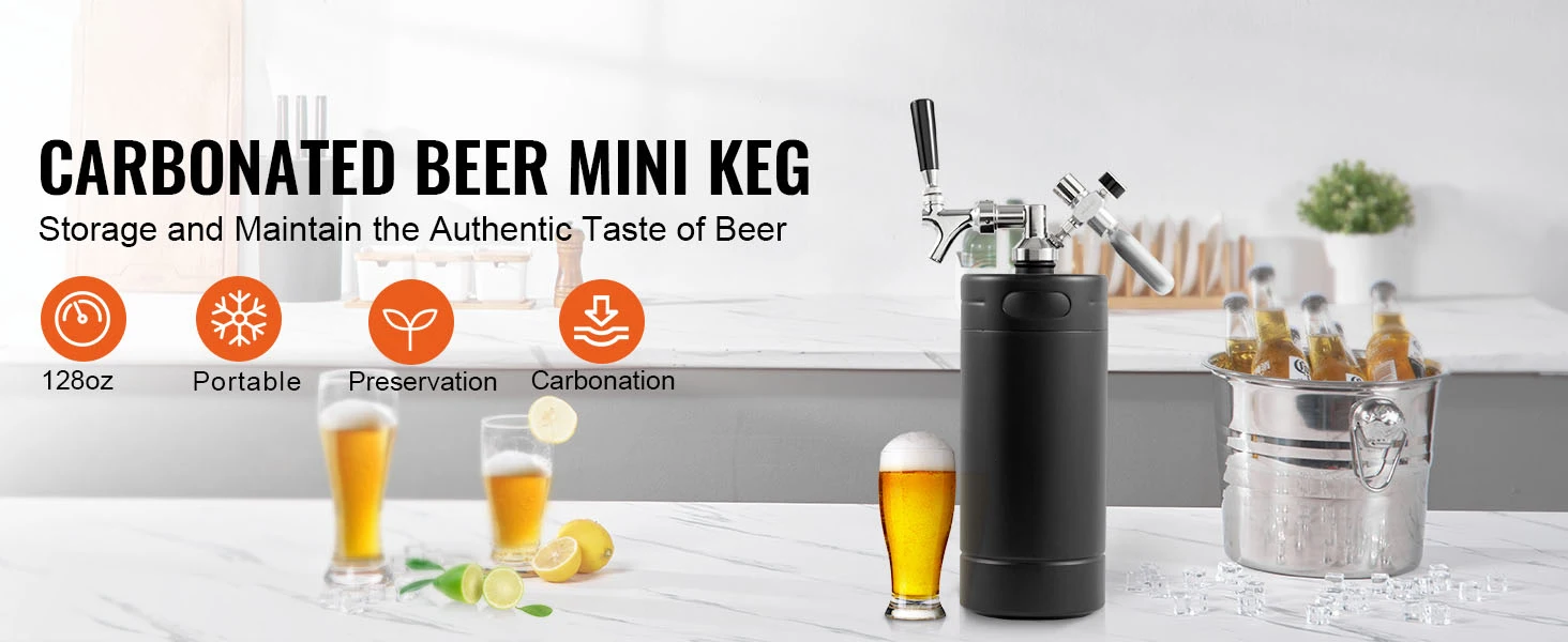 Portable Size: A 128oz carbonated beer mini keg, with dimensions of 5.3 x 7.7 x 18.3 inches, comes with a built-in portable handle. It is suitable for home gatherings or outdoor camping.