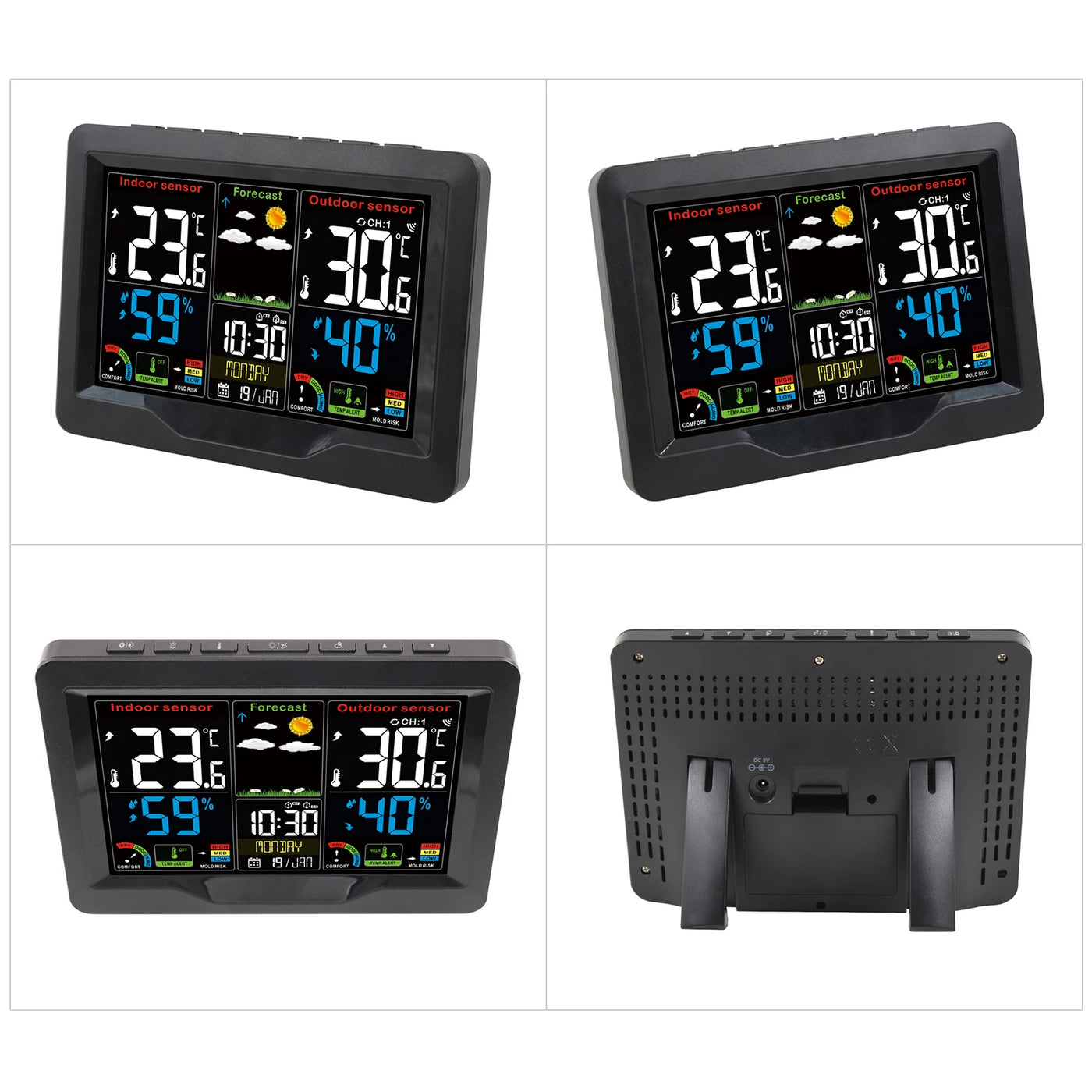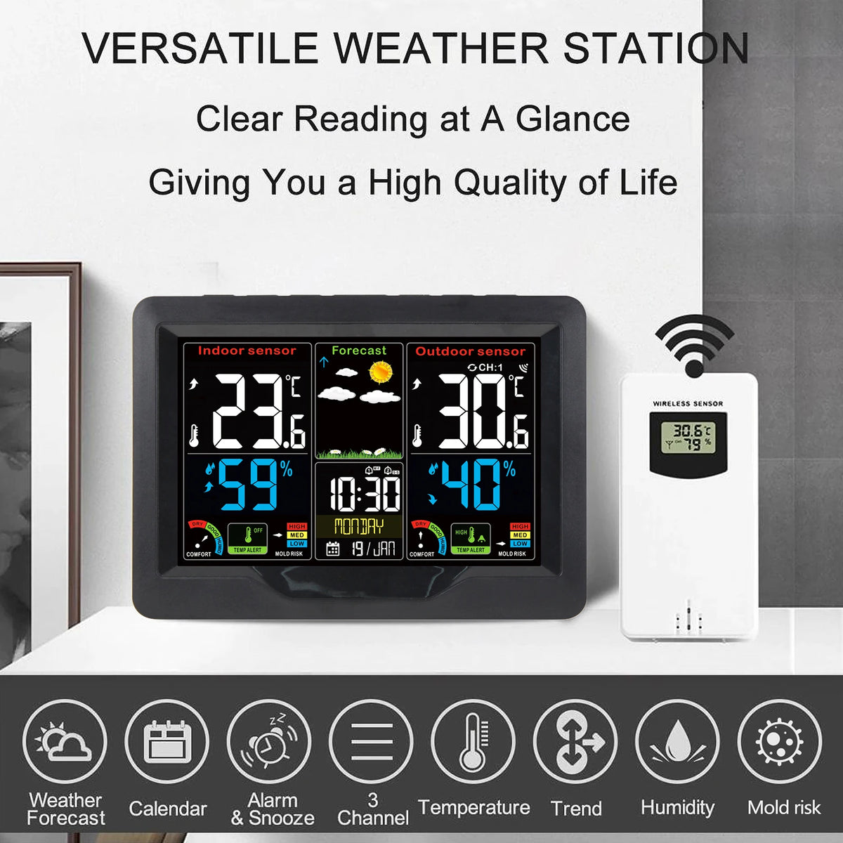Multifunctional Weather Station -- Adopt large LCD color screen to display rich information: Indoor/outdoor temperature and humidity, customized temperature (hi/lo) alert, time/date/week, dual alarm clock/snooze(extra 5-minute sleep), vivid weather forecast, mold and comfort level.